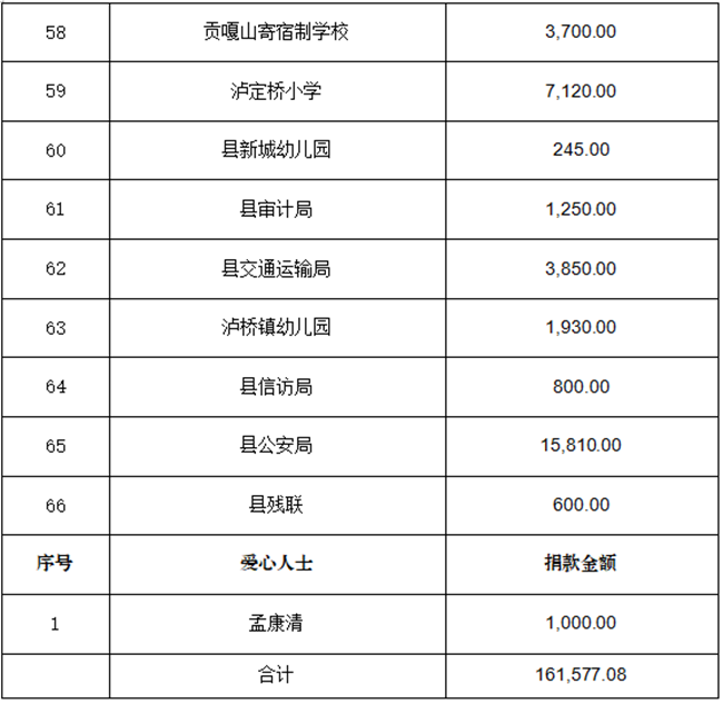 自开展“甘孜爱心慈善日”暨“5.8人道公益日”募捐活动以来,全县干部职工、社会各界爱心人士纷纷慷慨解囊,贡献自己的一份力量,每一份善款都承载着大家对公益事业的支持与对受助群体的关怀。为保证捐款使用的公开透明,现将本次公益日捐款情况公示如下: