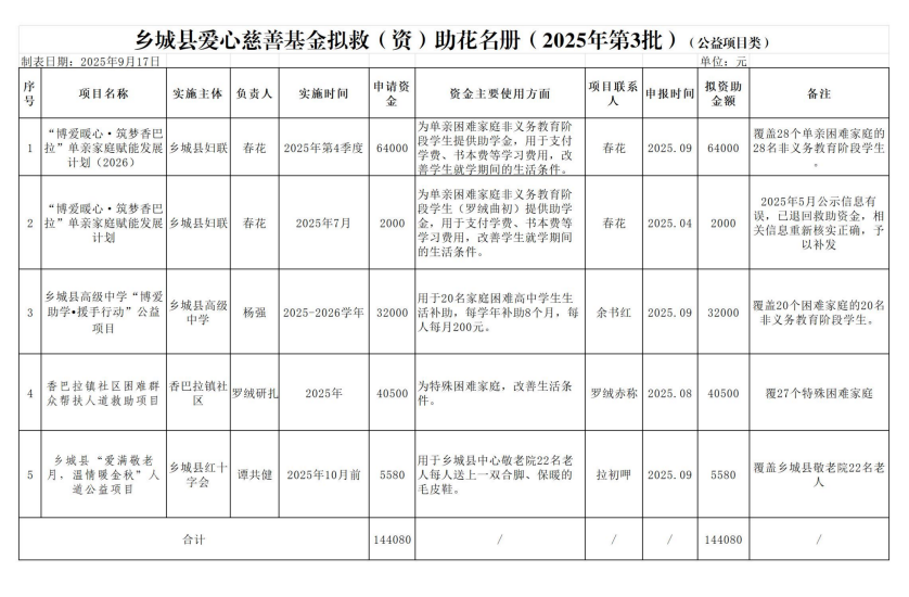 | 【公示】关于乡城县爱心慈善基金拟救(资)助对象的公示 (2025年第3批) |
