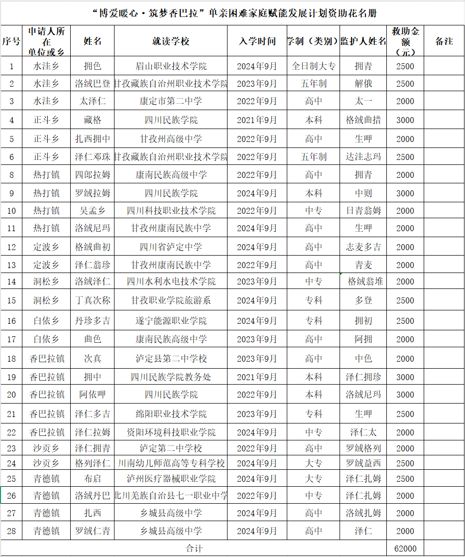 2025年,乡城县红十字会和乡城县妇女联合会联合发起“博爱暖心·筑梦香巴拉”单亲困难家庭赋能发展计划人道公益项目,旨在通过给予必要的支持和帮助,助力这些家庭的学生克服困难,实现学业梦想,为未来的人生奠定坚实基础。经各乡镇申报、县乡妇联审核、走访核实,申报乡城县爱心慈善基金62000元用于该项目实施,资助时间为2025年5月26日。